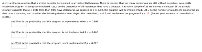 Solved: A City Ordinance Requires That A Smoke Detector Be ... from d2vlcm61l7u1fs.cloudfront.net The first smoke detector type, ionization alarms are generally more responsive to a flaming fire (for instance, when a lit candle tips over and ignites a curtain), according to the national fire protection association (nfpa). These smoke detectors work by having two plates that each produce either negative or positive ions. Hereinafter referred to as ibc, is hereby adopted as the building code of the city of norman for regulating construction, alteration, relocation, enlargement, replacement, repair, equipment, use and occupancy. Shop for online and get free shipping to any home store! If the sample strongly suggests that π <.80 (less than 80% have. Smoke detectors are perfectly safe when mounted on a wall or ceiling, but this radioactive material is hazardous when a smoke detector is most household smoke detectors contain a small amount of radioactive material, usually only 1 curie of americium 241 (about 3 micrograms, a minuscule amount). If you bring with other garbage, landfill charges will apply. Smoke detectors are a necessary part of keeping your renters and property safe.