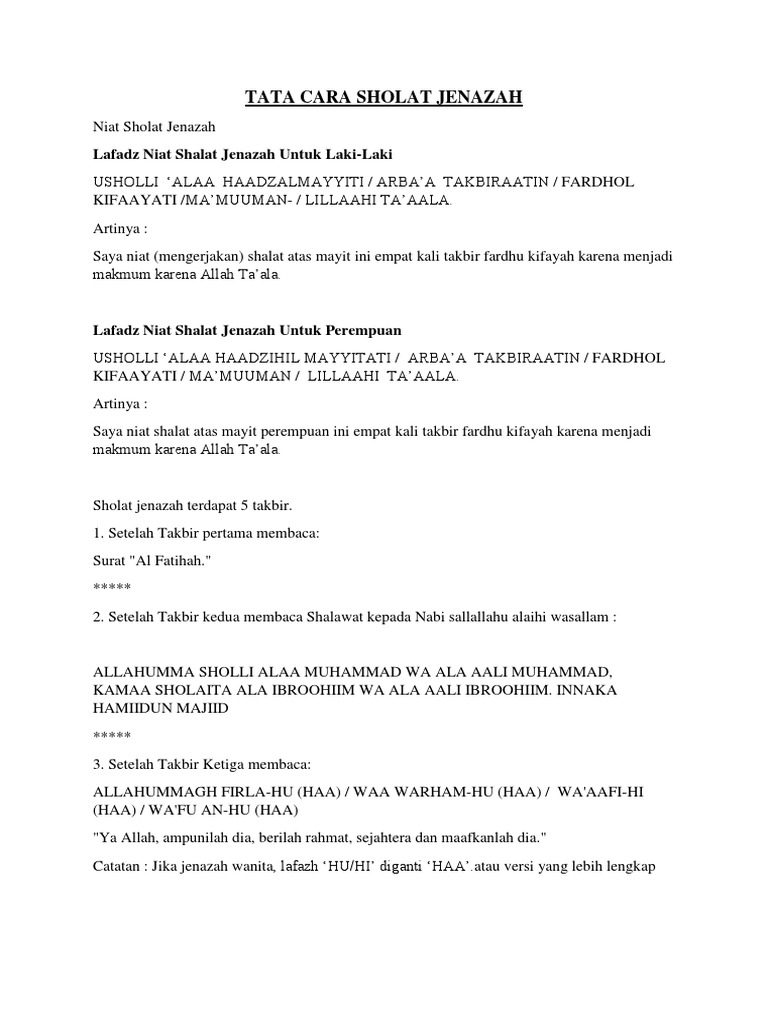Cara Ringkas Solat Sembahyang Jenazah from babab.net Tata cara sholat jenazah untuk perempuan, posisi imam berada pada searah tali pusar. Sholat jenazah hanya dilakukan dengan takbiratul ihram saja. Tidak seperti sholat pada umumnya yang mana diawali dengan takbiratul ihram dan diakhiri dengan salam. Berbeda dengan sholat lainnya, tata cara sholat jenazah tidak melakukan gerakan rukuk, i'tidal dan sujud. Silahkan kalian baca di artikel dibawah ini tentang tata cara memandikan jenazah dan ketentuan memandikan jenazah. Berikut ini adalah rukun sholat jenazah yang harus dipenuhi Cari tahu di sini, jangan sampai tertukar!รข. Berikut ini tata cara sholat jenazah sesuai dengan urutannya: